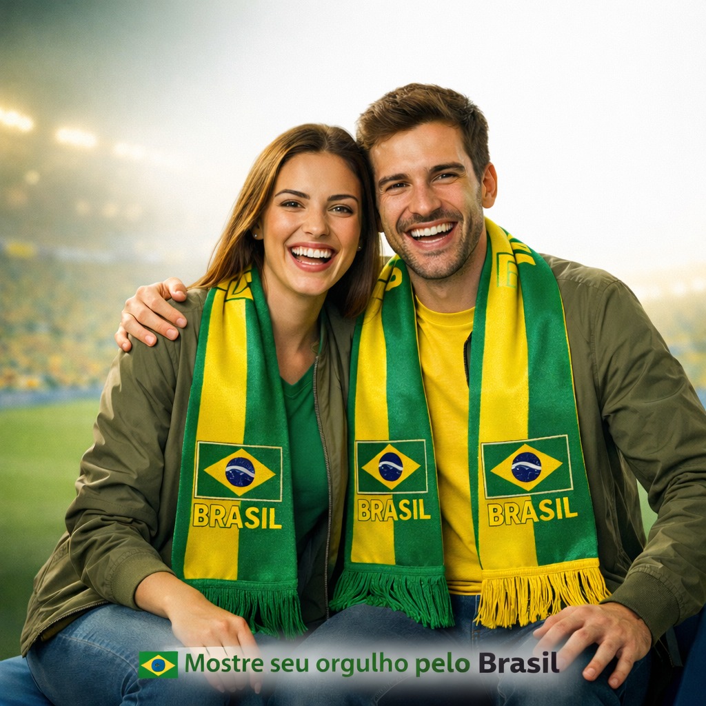 Adquira o Cachecol Brasil para a Copa do Mundo 2026, nas cores Verde e Amarelo, com Bandeira do Brasil e Franjas