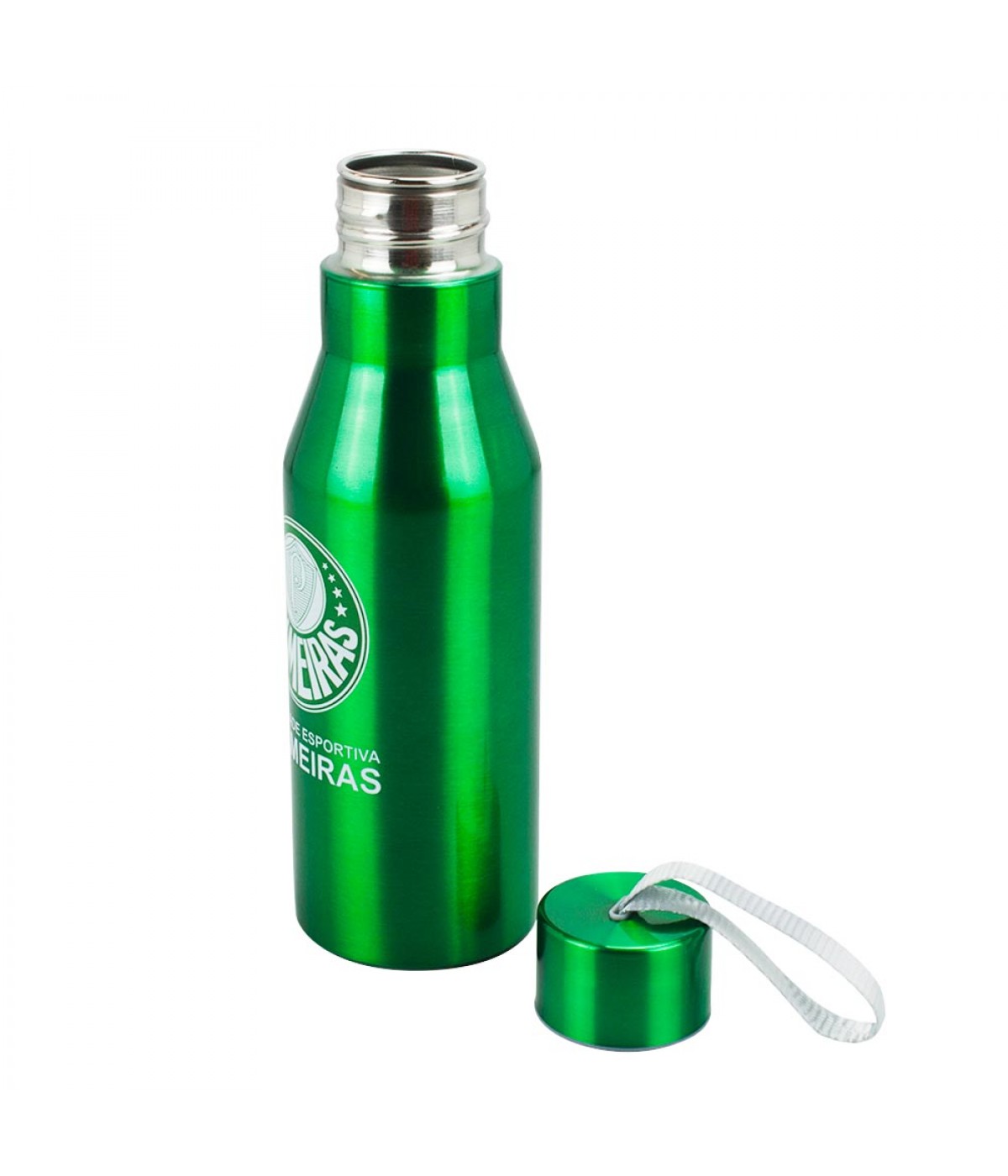 Garrafa de inox capacidade para 600 ml gravado com escudo do Palmeiras. Tampa rosqueável e vem com cordão.